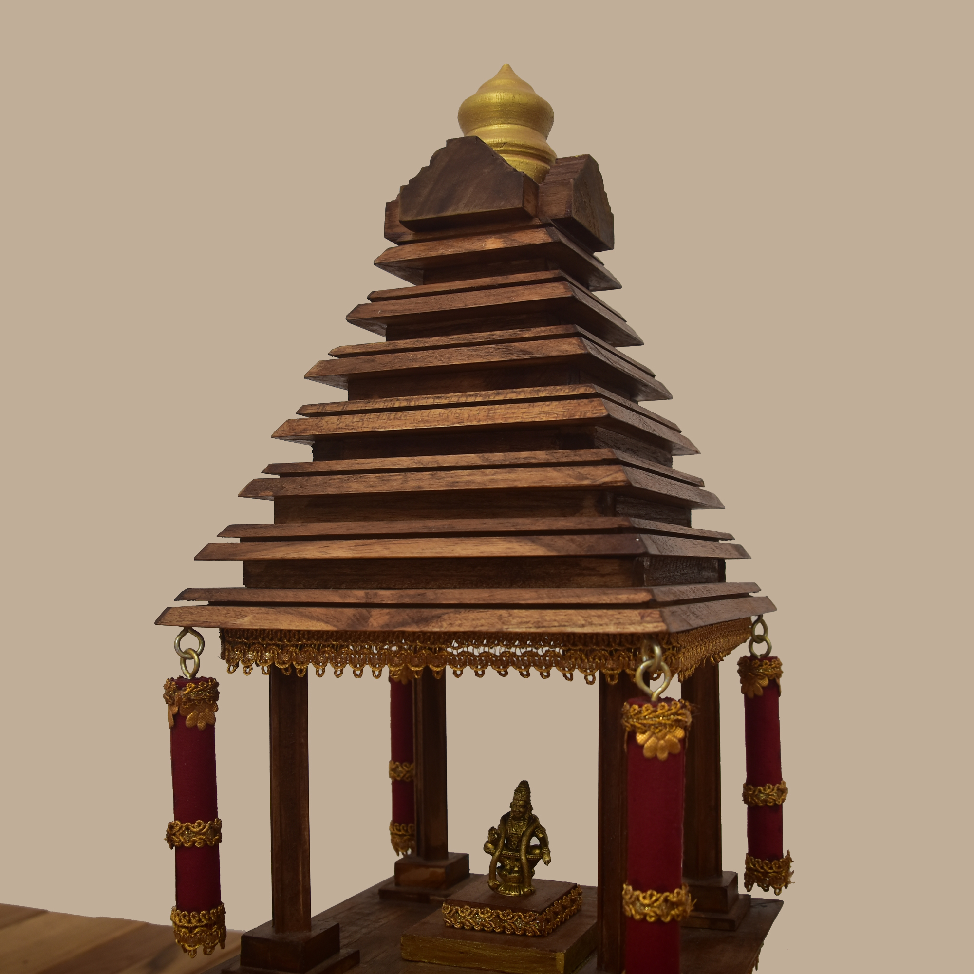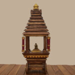 Crafted entirely from premium teak wood, this compact wooden temple embodies timeless artistry in a refined form. The structure features intricate carvings on its square base, with steps leading to a sanctum doorway. A dome‑like crown and alcoves add architectural depth, while the natural teak finish highlights durability and elegance.