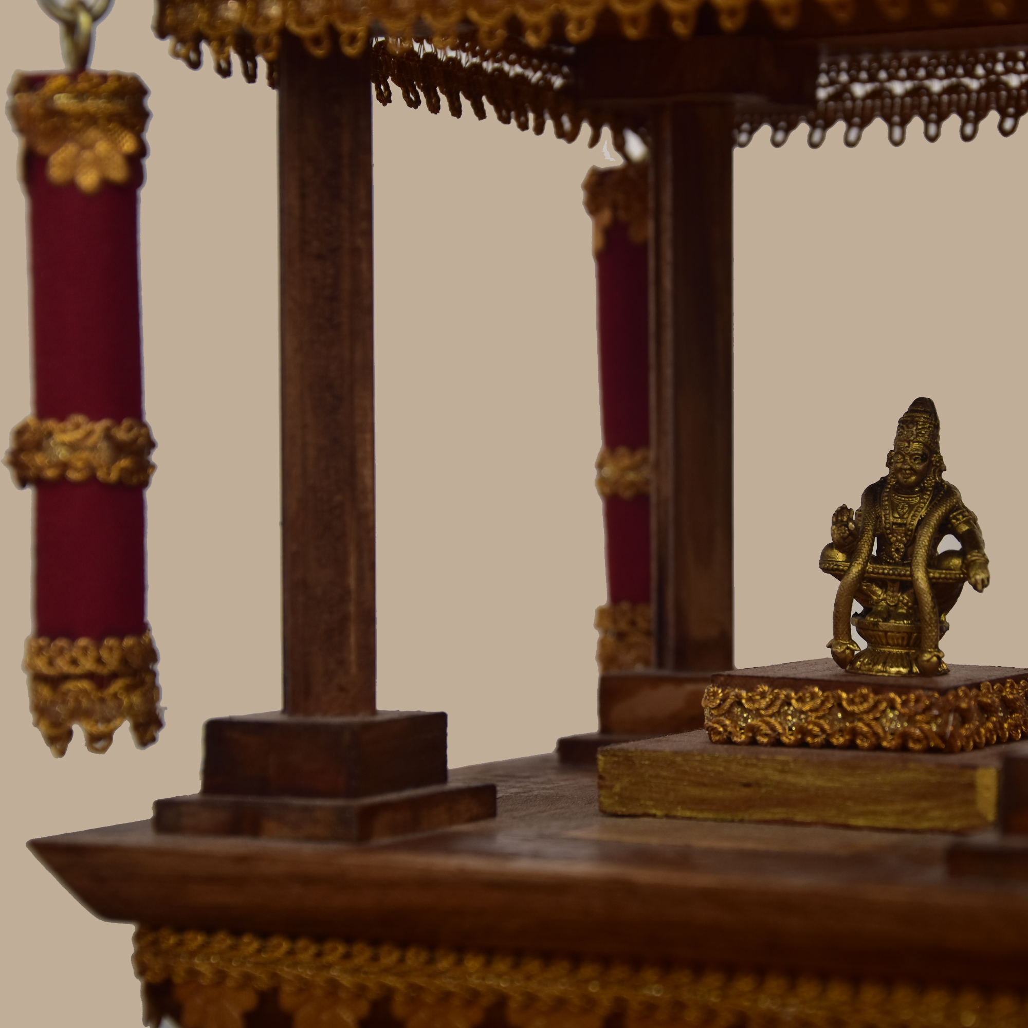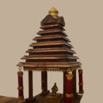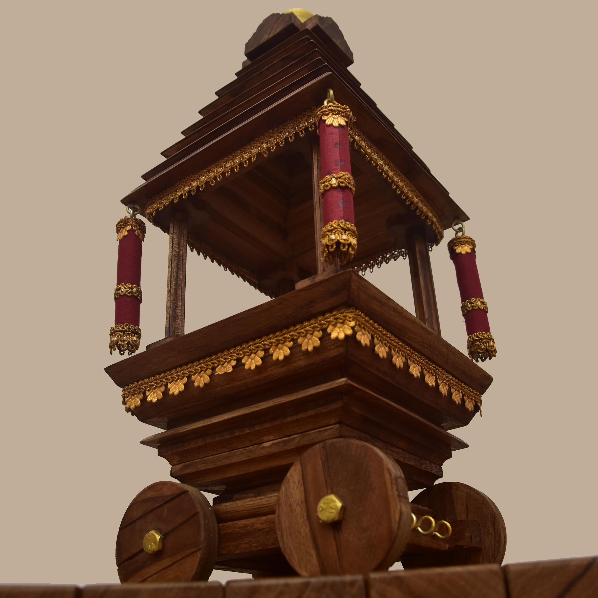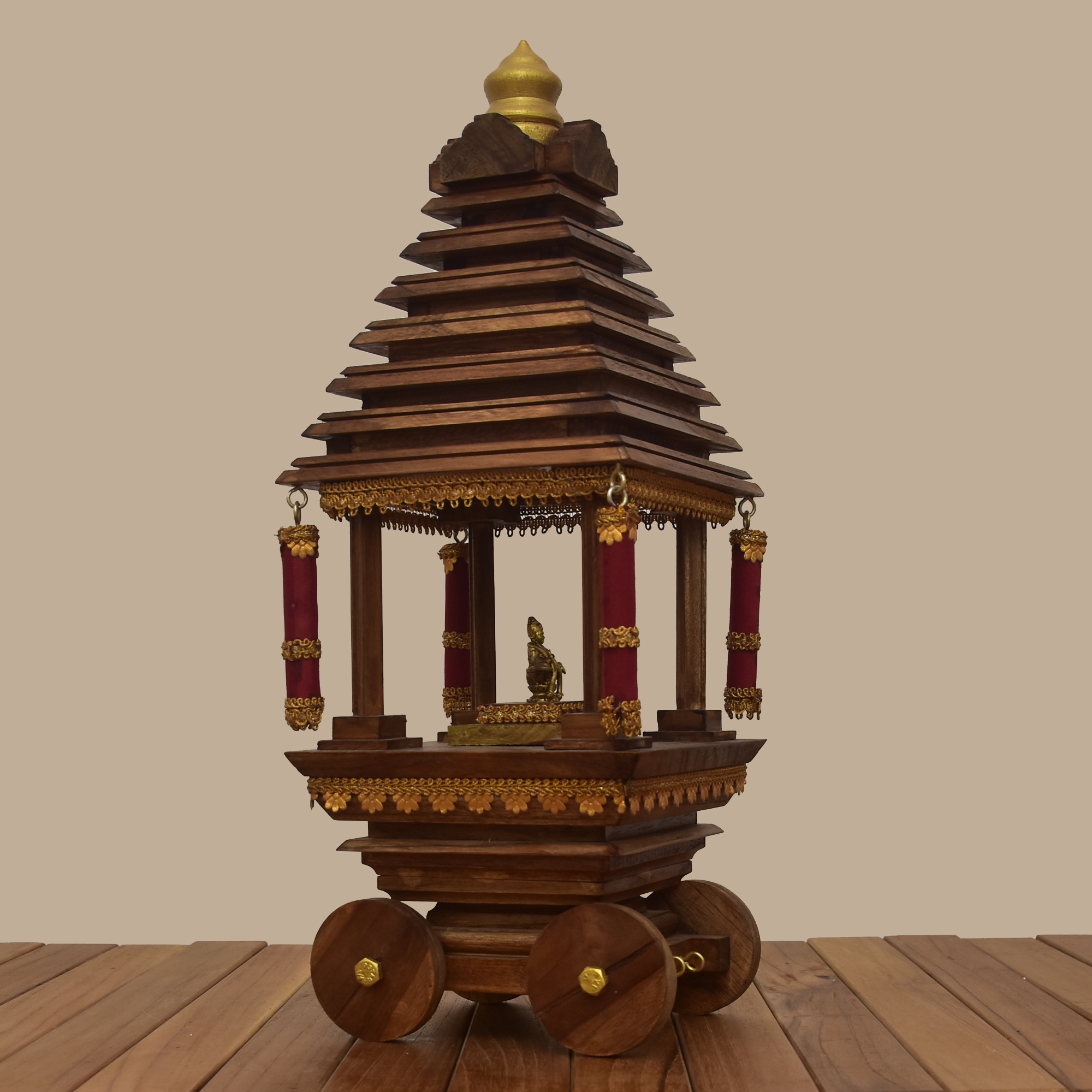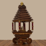 The Divine Ther is a handcrafted temple chariot made entirely from premium teakwood, designed to capture the grandeur of Tamil temple processions. Its tiered roof, ornate carvings, and finely detailed pillars reflect traditional artistry, while the dome crown and wheels echo the ceremonial ther tradition.
