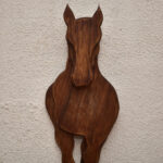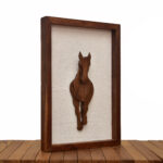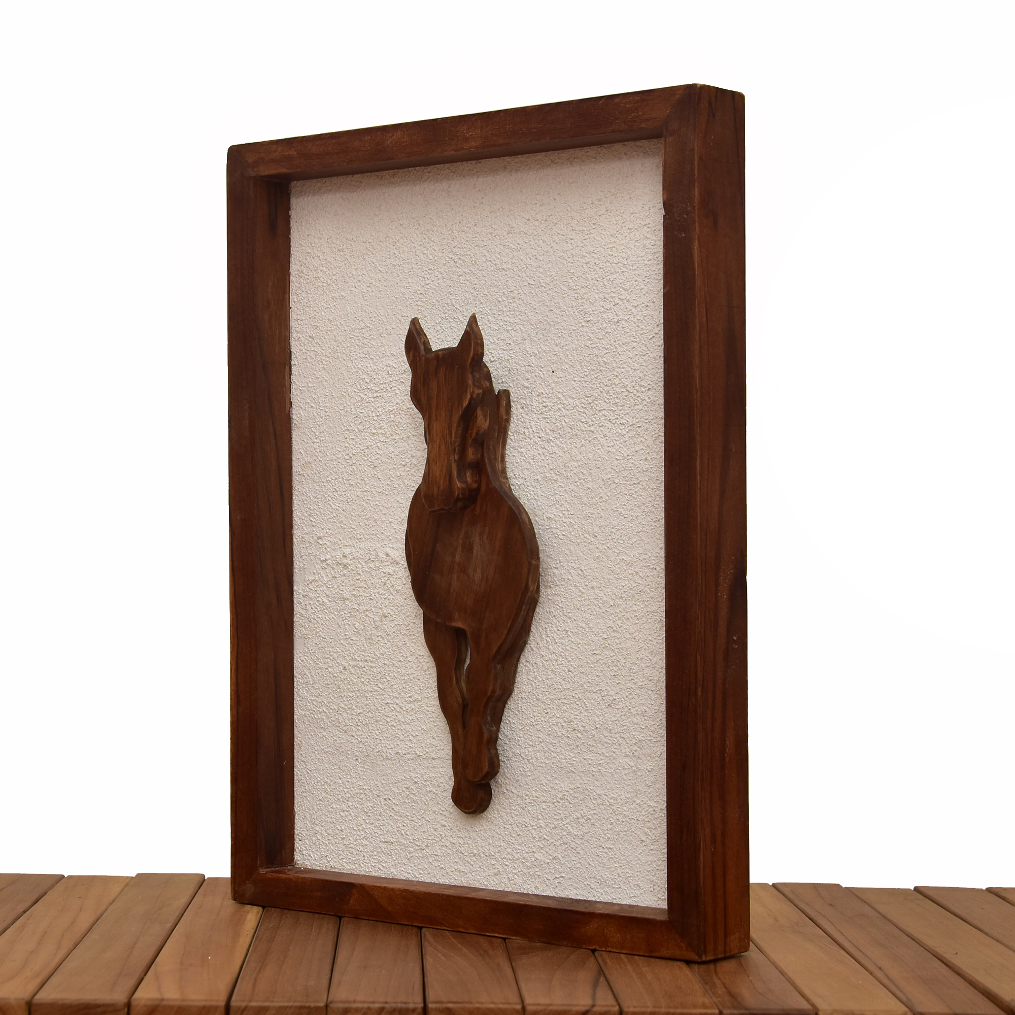 Horse of Victory is a striking A3-sized wall frame, handcrafted entirely from solid teak wood, renowned for its durability and rich natural grain. The centerpiece features a stylized horse carving that appears to surge forward from the frame, creating a dynamic three-dimensional effect that symbolizes strength, speed, and triumph.