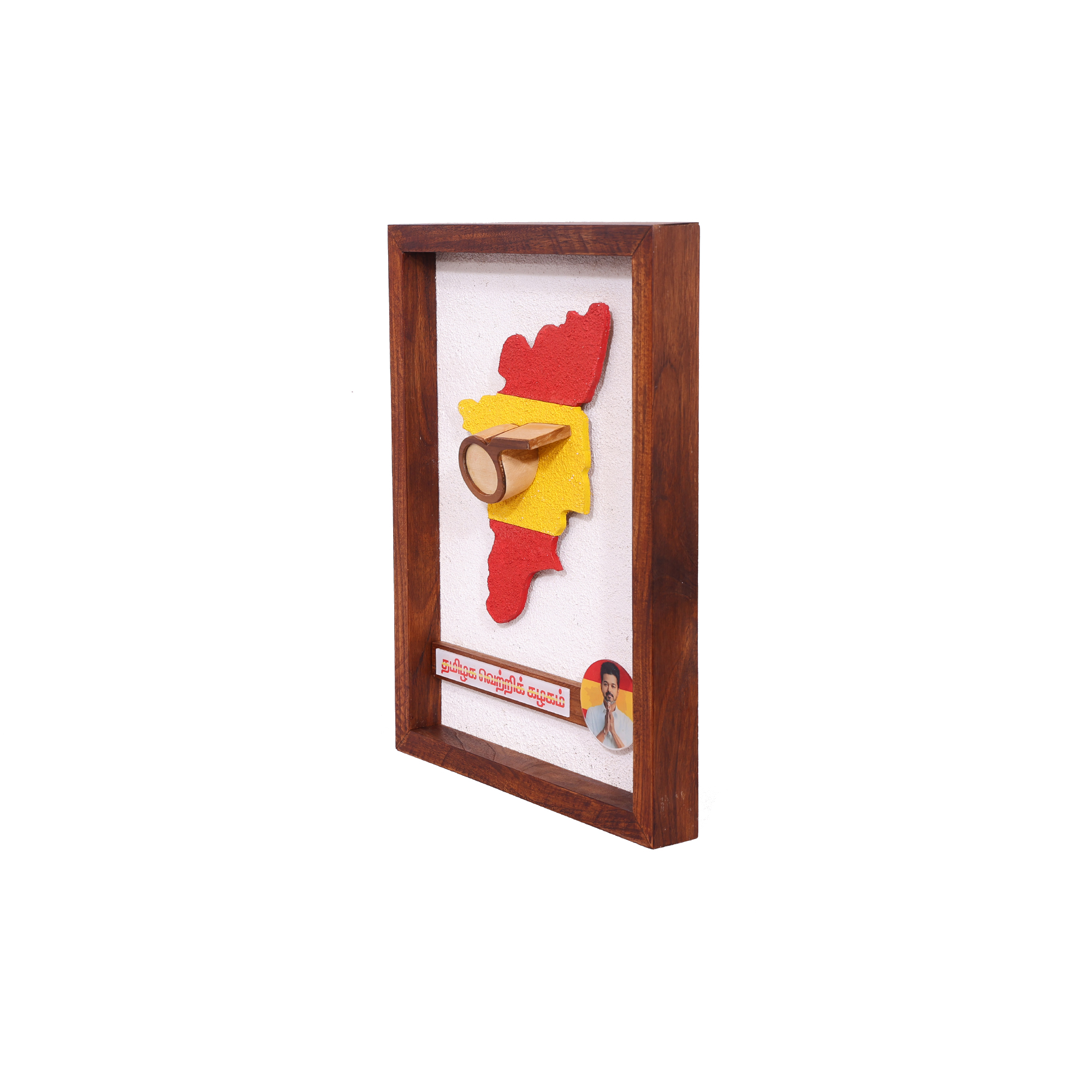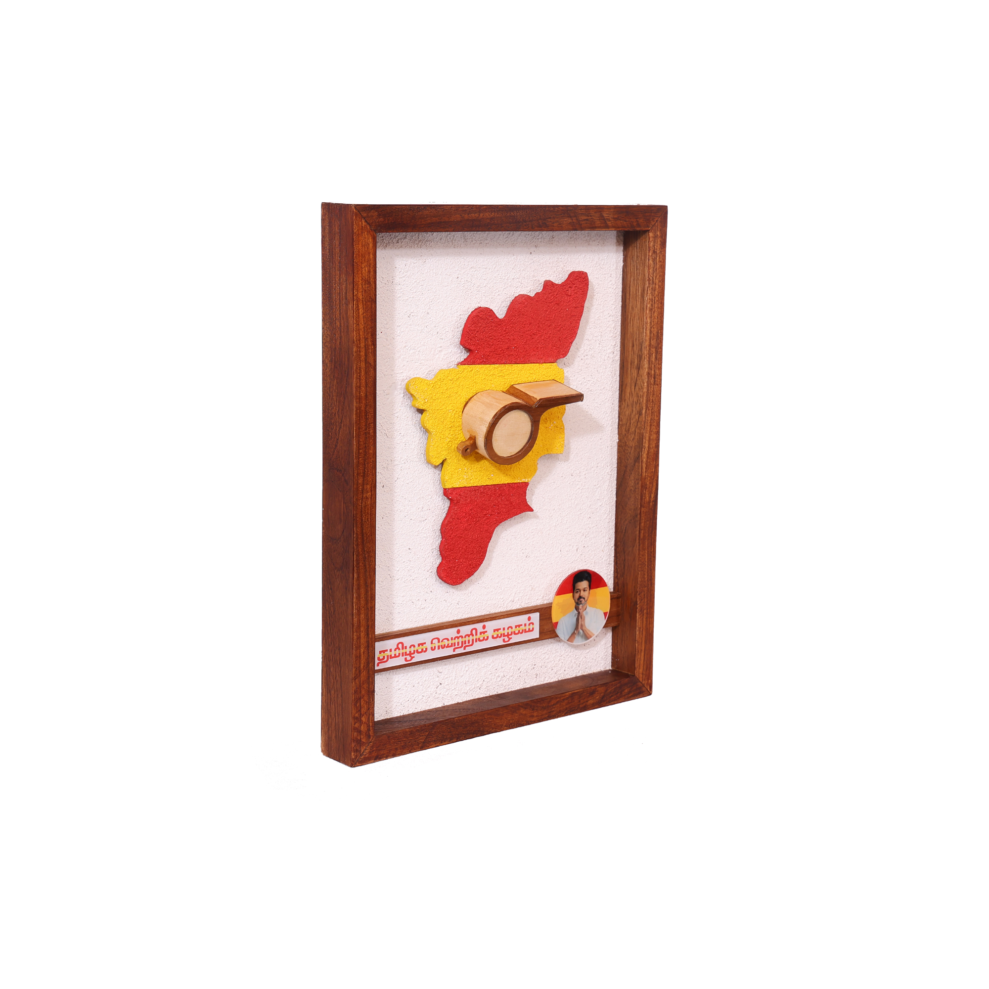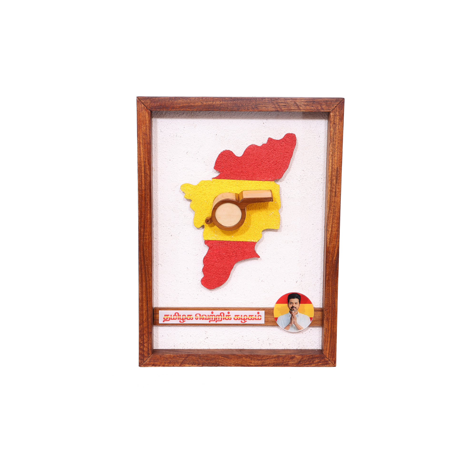 Celebrate the spirit of victory with this handcrafted wall art inspired by Thalapathy Vijay and his Tamilaga Vettri Kazhagam (TVK). Featuring a stylized Tamil Nadu map in bold red and yellow reflecting their flag, paired with Vijay’s iconic presence and the election symbol (Whistle) of the (TVK) party. This piece embodies pride, heritage, and people’s power.